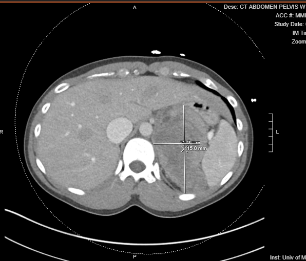 Luckily, there is a local-ish cash-pay imaging center within 1.5 hours of me. I was able to schedule my CT chest ordered by my new PCP. This cost me $272. I had this done about 6 weeks after my onset of symptoms on 2/26. By this time, I had about a 10-pound weight loss. I asked the tech who was imaging me if I could see the images. She could see that I was in my scrubs, so she asked me what I did. After the scan, she showed me the images. She pointed out several pieces of anatomy then pointed to a large structure and said, “I don’t know what that is.”